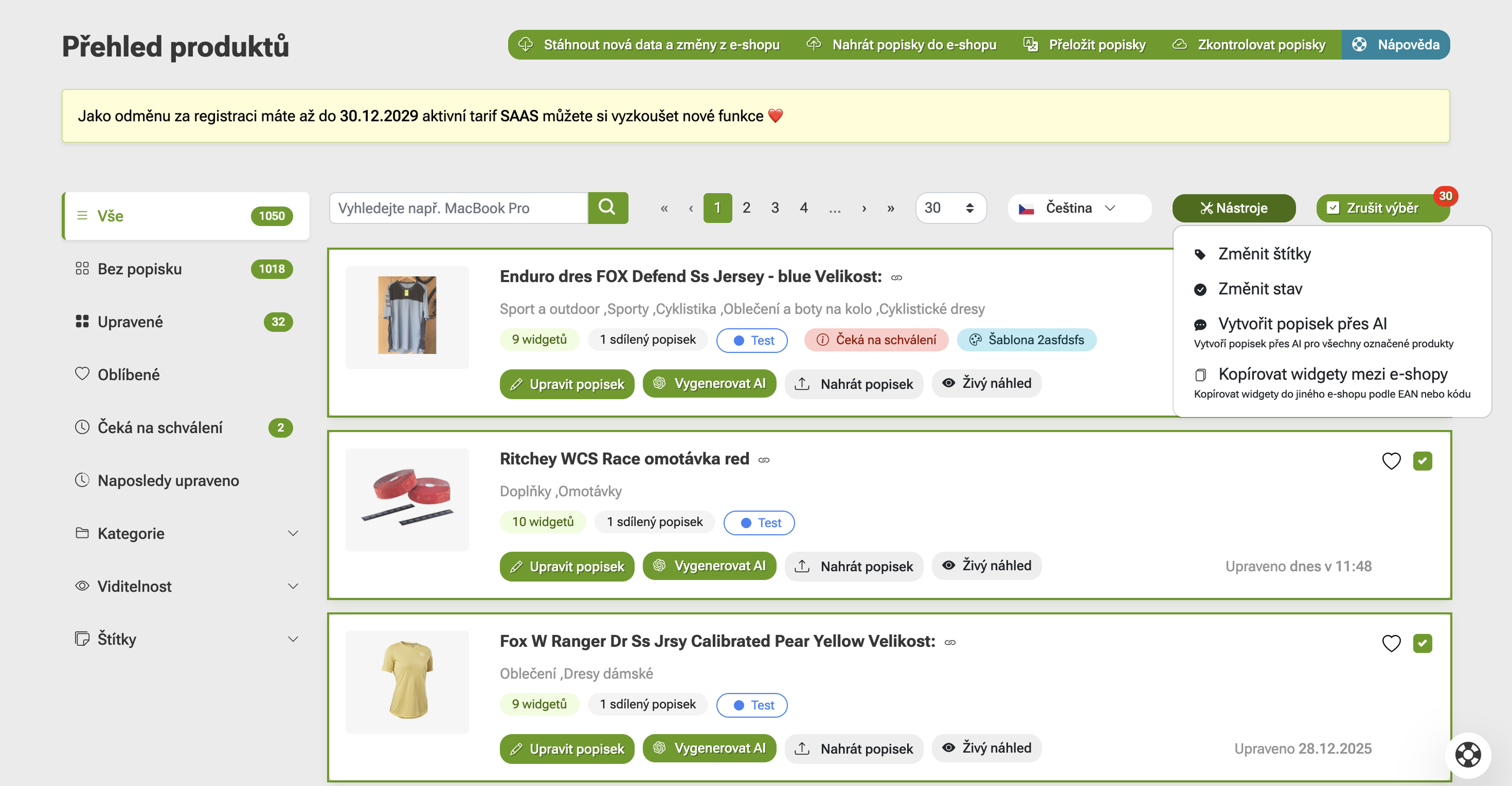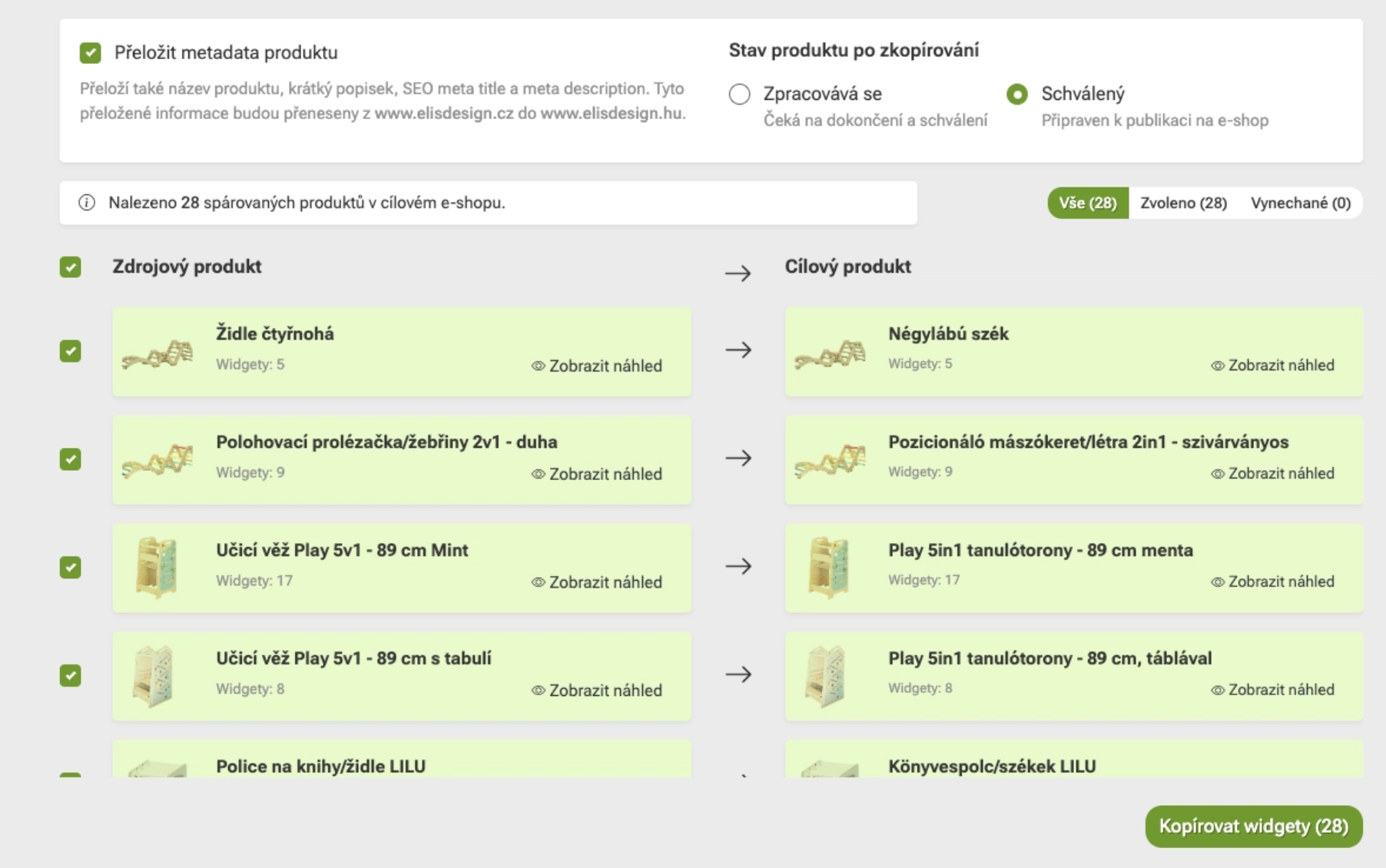 Funkci můžete otestovat velmi snadno - vyberete produkty, které mají widgety a zvolíte si ve funkcí "Kopírovat widgety mezi e-shopy".