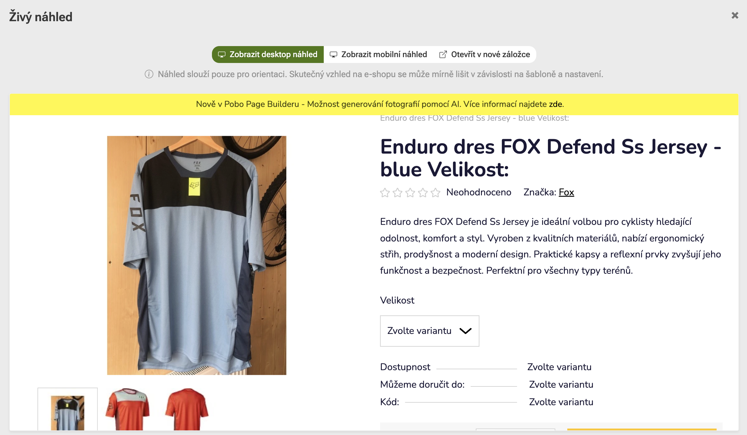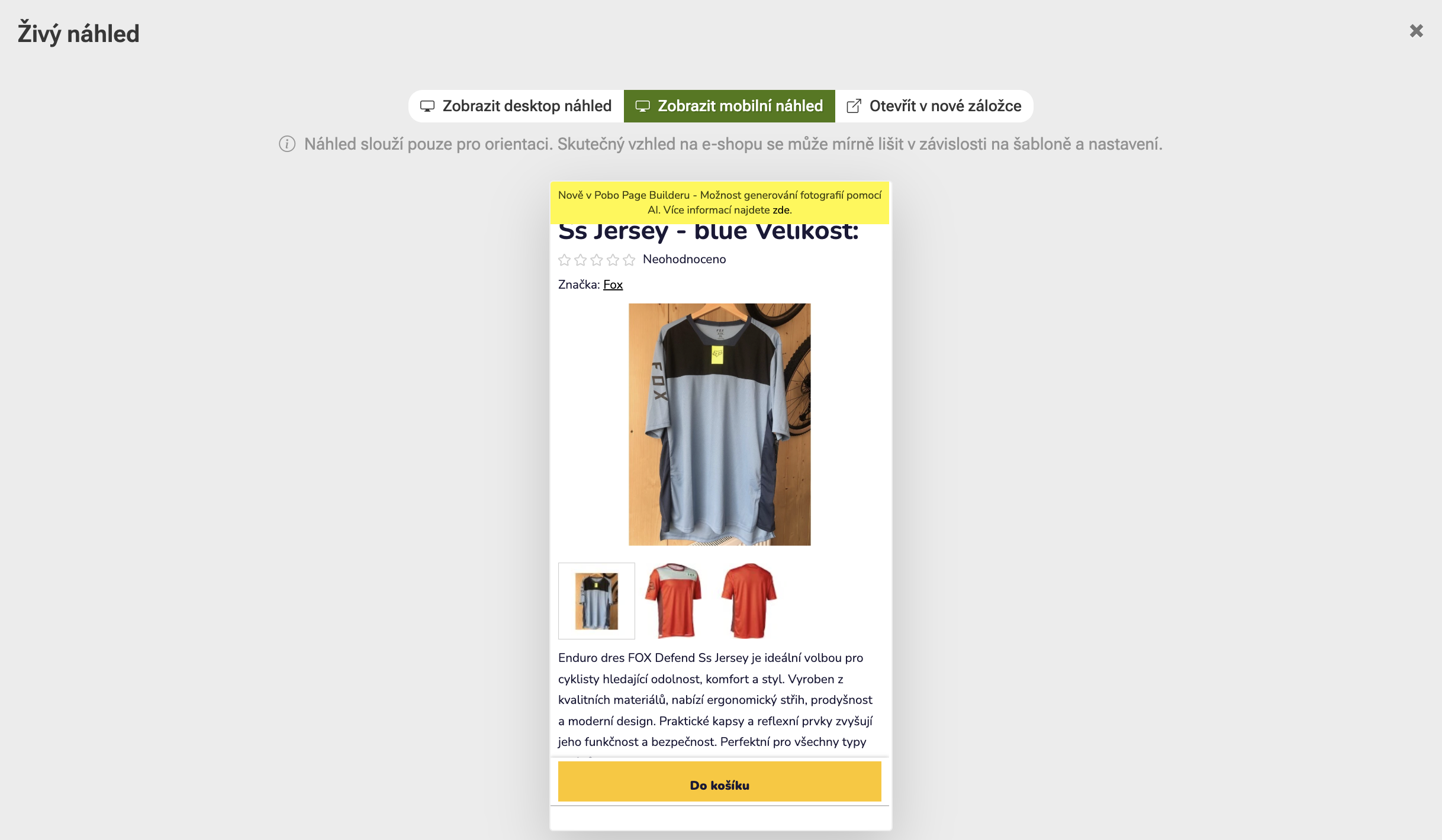 Do Pobo Page Builder jsme vrátili dlouho poptávanou funkci živého náhledu popisků na desktopu a mobilu. Na kartě produktu nebo v přehledu stačí kliknout na tlačítko "Živý náhled", následně se otevře modální okno, ve kterém lze přepínat mezi náhledem na PC a mobilním zařízení.