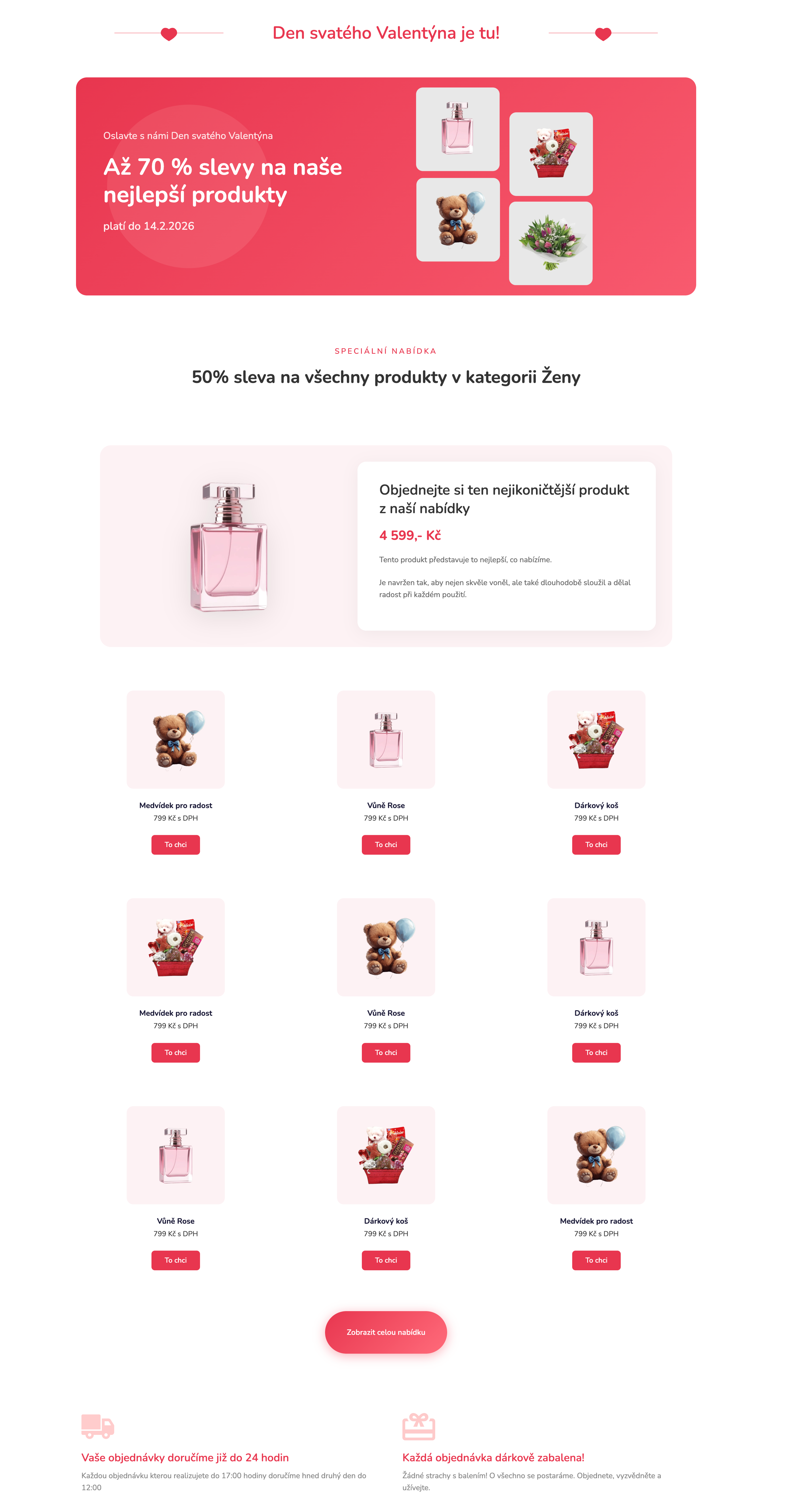 Valentýnská šablona slouží jako hotový základ pro landing page, která návštěvníky navede k výběru dárku bez zbytečného hledání.