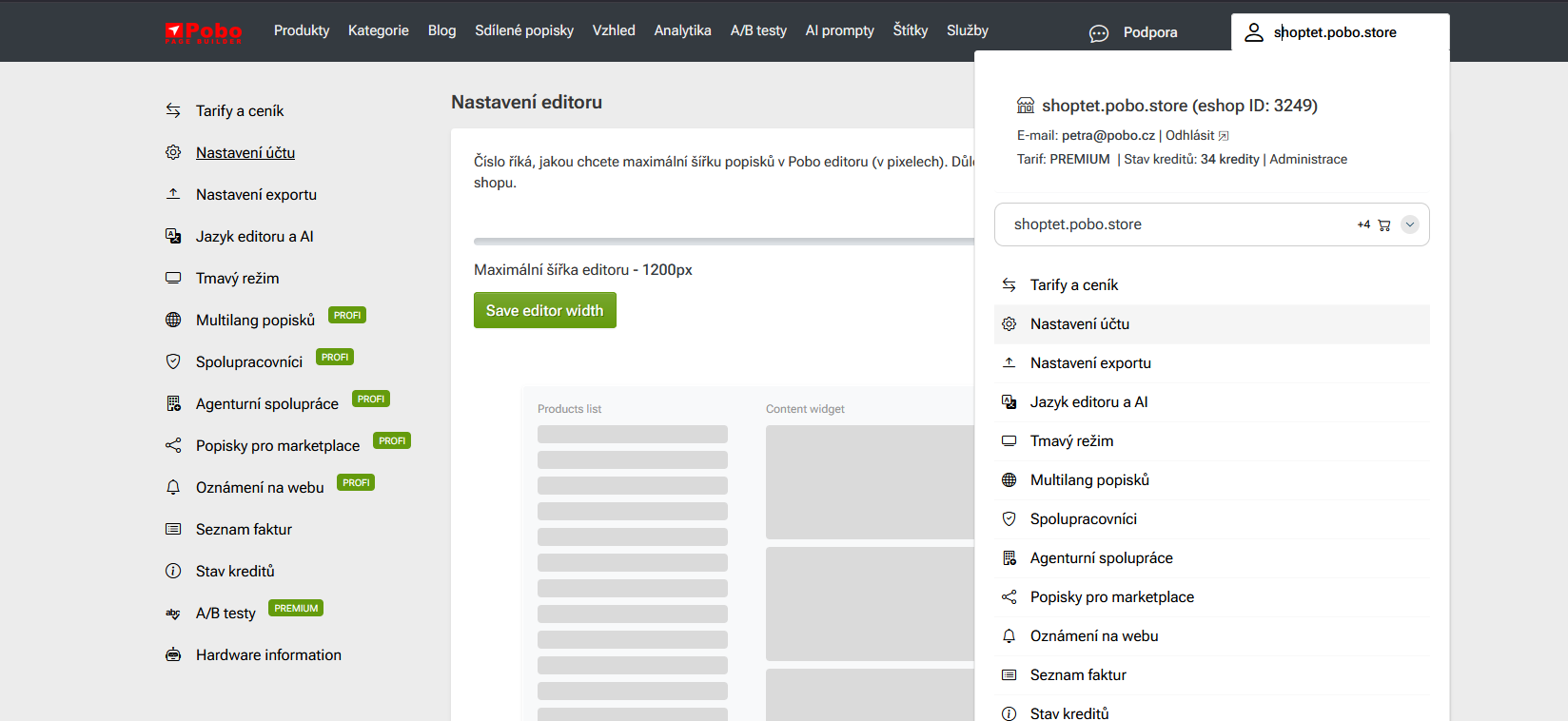 V administrátorském menu zvolte možnost Nastavení účtu a potvrďte tlačítkem Save editor width.