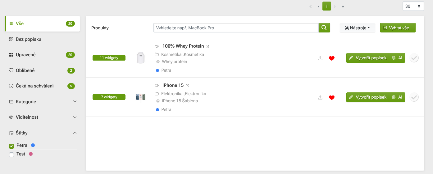 Na seznam produktů můžete nyní zvolením vybraného štítku / štítků v levé nabídce dole (sekce Štítky) filtrovat produkty, které jsou daným štítkem označeny.