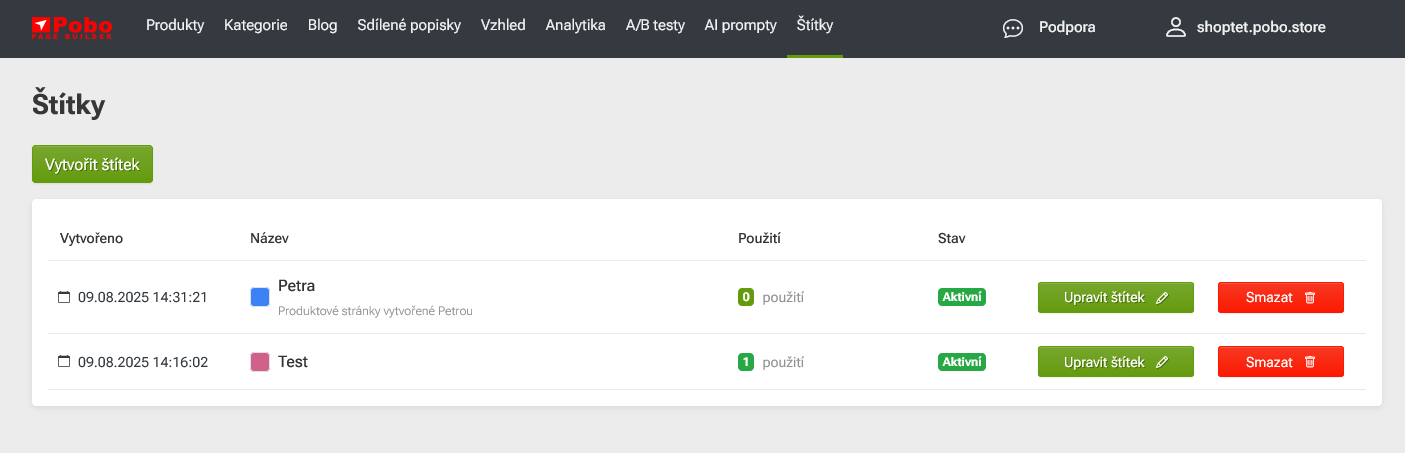 Štítky vytváříte a spravujete přímo v hlavním horním menu - nabídka Štítky.